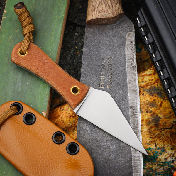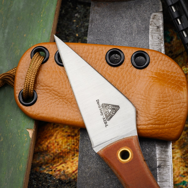Handle -  2 ⅝” natural micarta with brass pins and brown lanyard