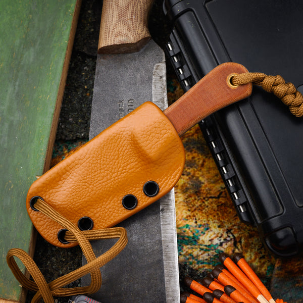 Comes with a  Raptor Skin Holstex sheath and brown lanyard