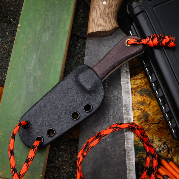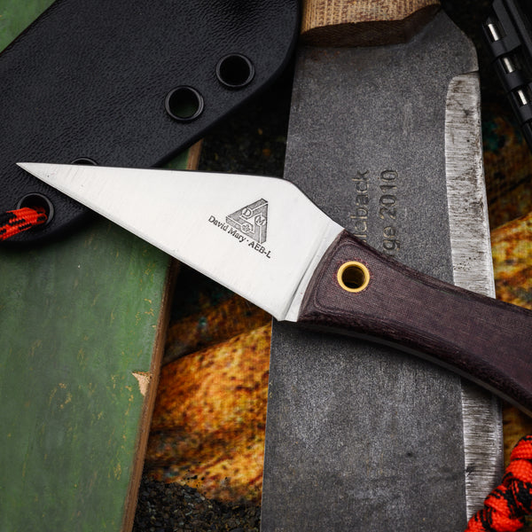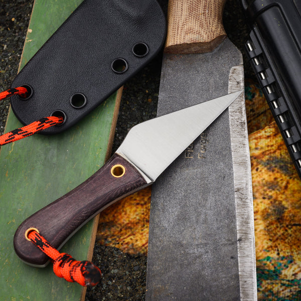 Handle -2 ⅝” burgundy micarta with brass pins and orange lanyard