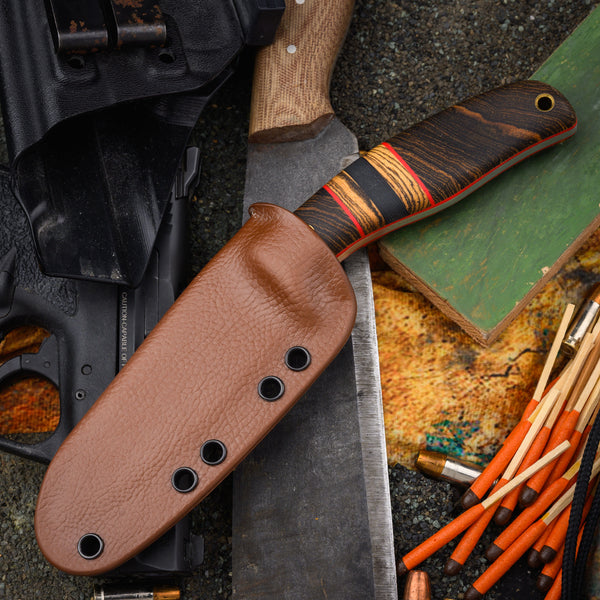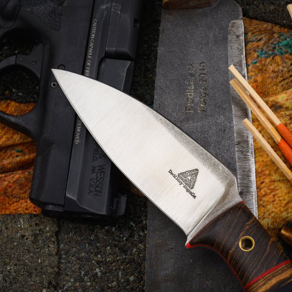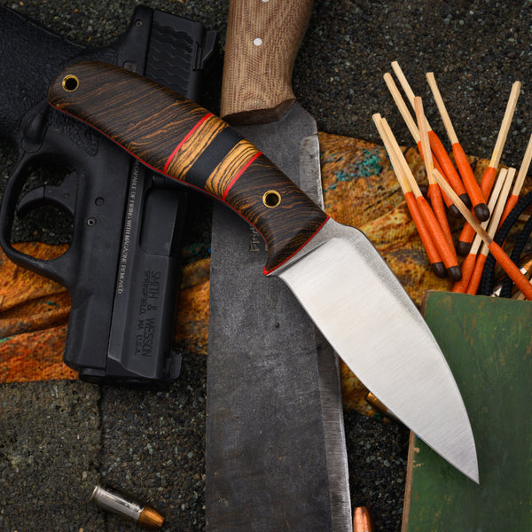 Handle - 4 ⅝” Bocote scales, red liners and spacers with Bocote and Suretouch inlay