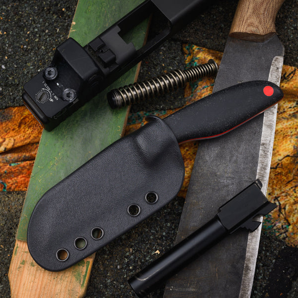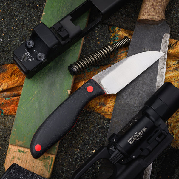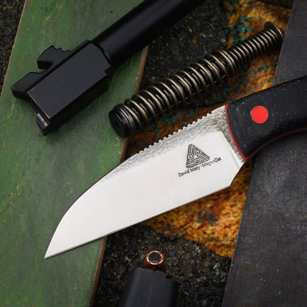 Blade - 3 3/16” (3 1/16” sharpened) full flat ground Magnacut with spine jimping