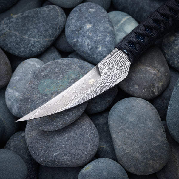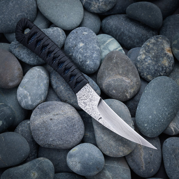 The Greg Moffatt Go-Mai Pikal features a 5-layer nickel and 1095 Damascus blade in a pikal configuration with epoxy soaked black cord over black ray skin. This go-mai construction produces a stunning visual pattern while the pikal blade shape delivers purpose-built defensive capability — a functional art piece from Greg Moffatt's shop.