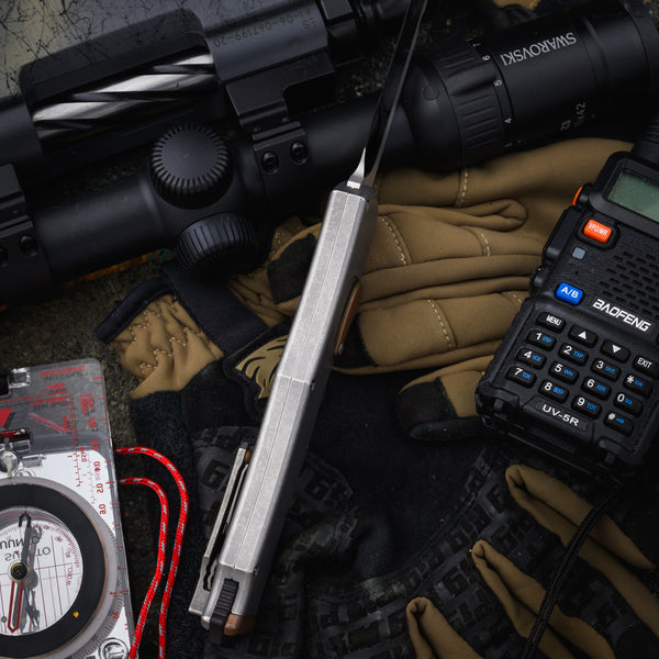 Blade - 3 9/16” (3 ⅛” sharpened) hollow ground and mirror polished Elmax Tanto with hand rubbed flats