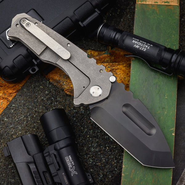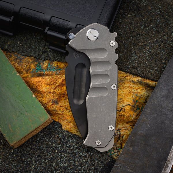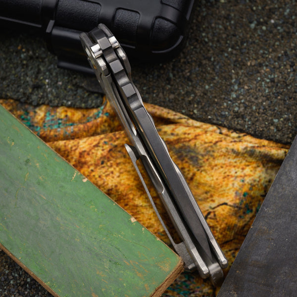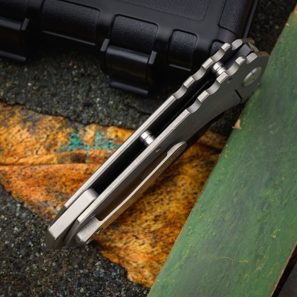 Handle - 5 ⅕” stonewashed titanium framelock with stainless hardware and skull crusher backspacer