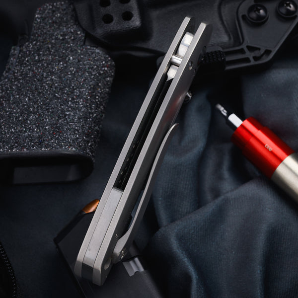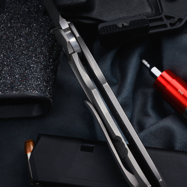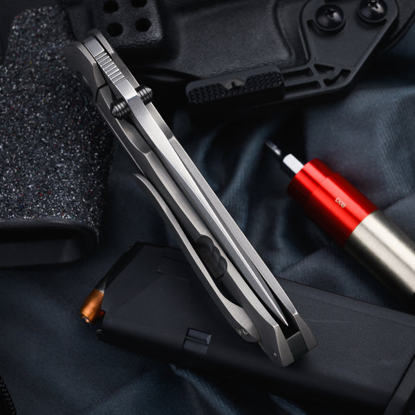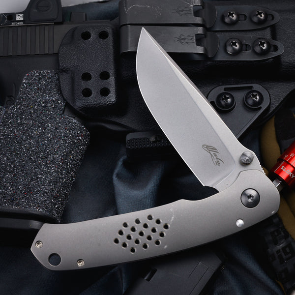 The Nalu Boersma Jaeger is a substantial framelock folder from one of the custom knife world's rising talents. With a stonewashed and hollow ground Elmax blade featuring dual stepped zirc thumb studs and a swedge, paired with a stonewashed titanium handle accented by zirconium hardware, this Jaeger is built for serious collectors who appreciate both form and function.