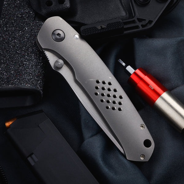 Handle - 5" stonewashed titanium framelock with stainless hardware, zirc backspacer and pivot