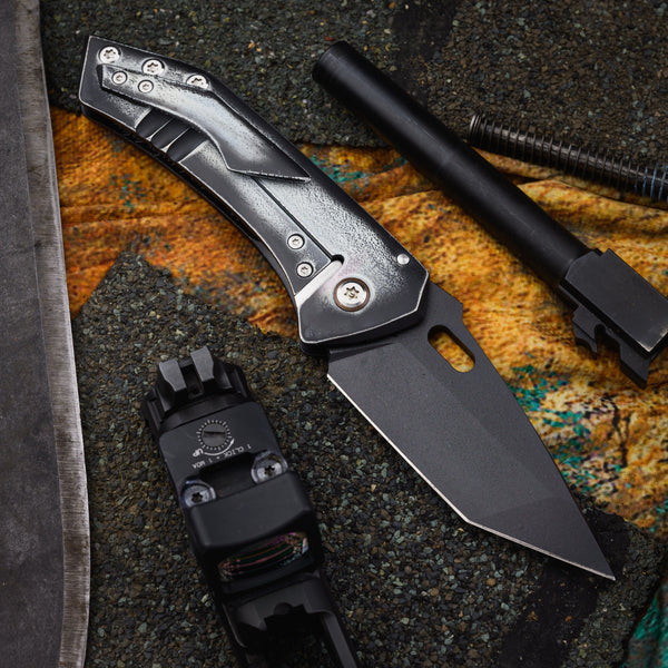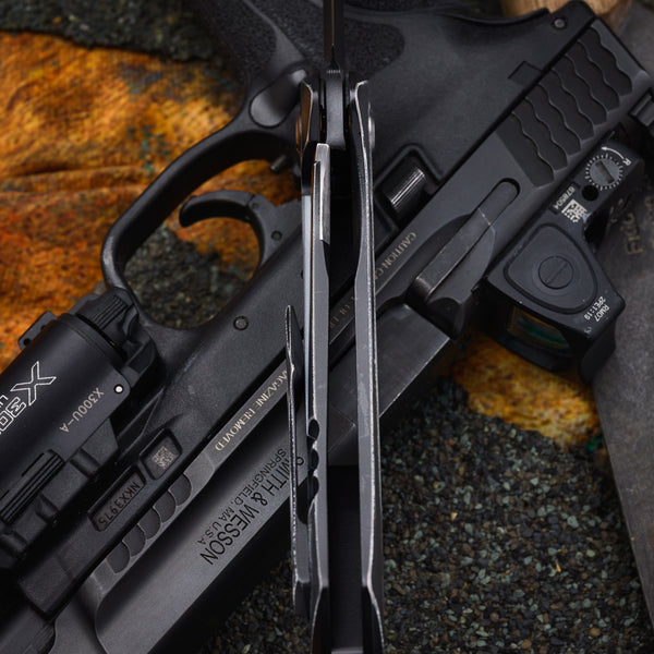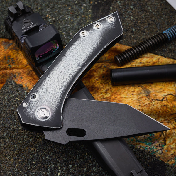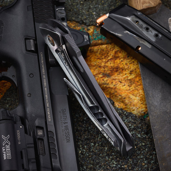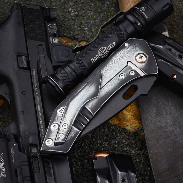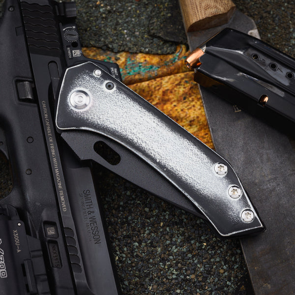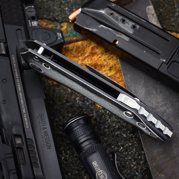 Handle -5 ⅛” black and white titanium framelock with stainless hardware, lockbar stabilizer and black and white back spacer