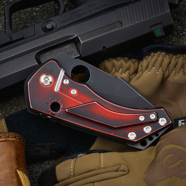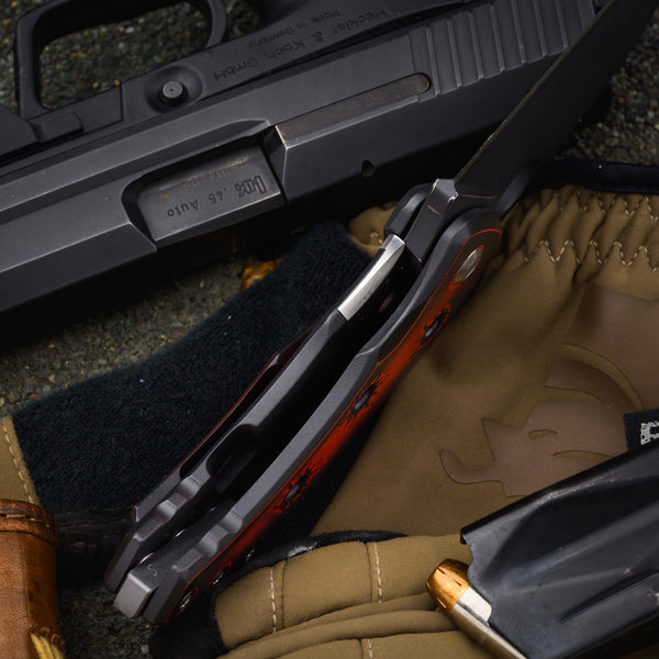 Handle - 4 ½” black and red titanium framelock with lockbar stabilizer, bullet holes, stainless hardware and zirconium back spacer