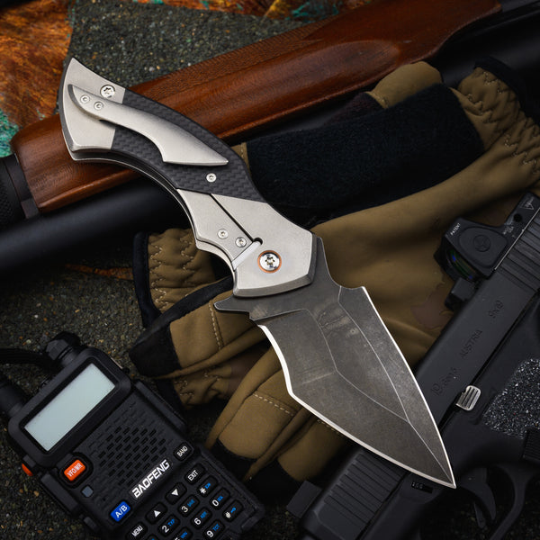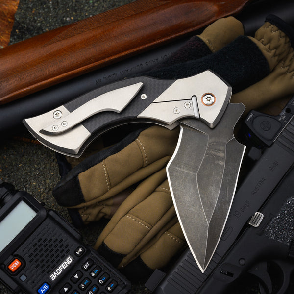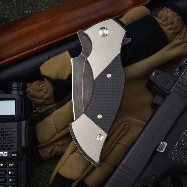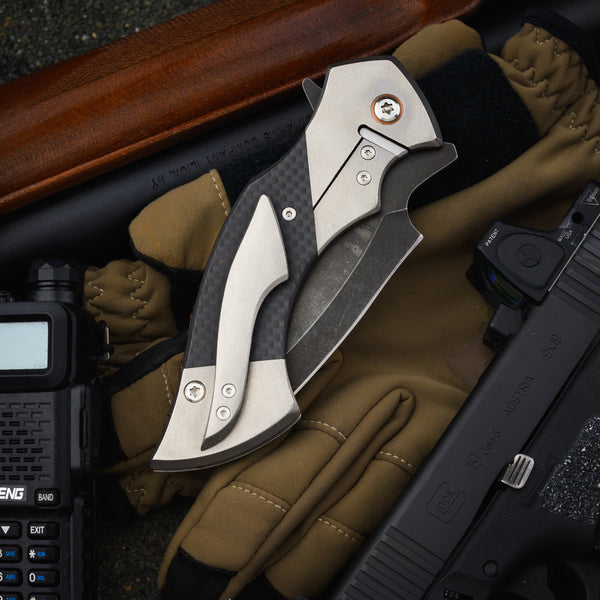 Blade - 4” (3 ¾” sharpened) blackened recurve tanto muti grind CPM10V flipper with polished swedge
