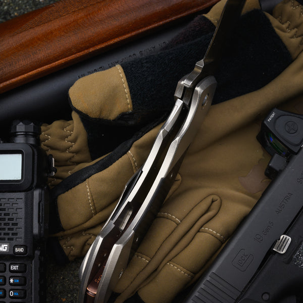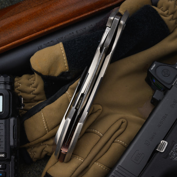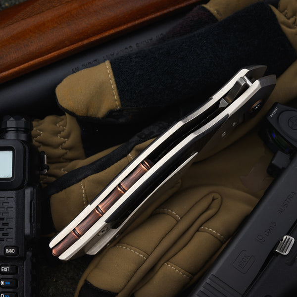 Handle - 5 ⅝” orange peeled titanium framelock with lockbar stabilizer, carbon fiber inlay, stainless hardware and copper bamboo backspacer