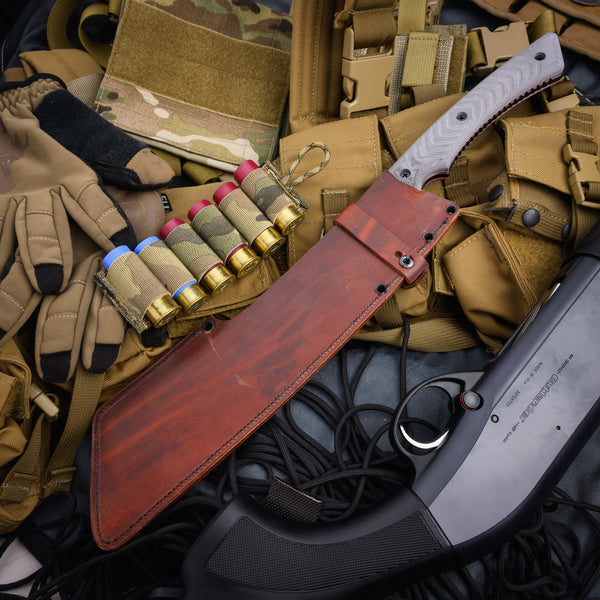 Comes with hand stitched 6mm leather sheath with leather retention strap and snap